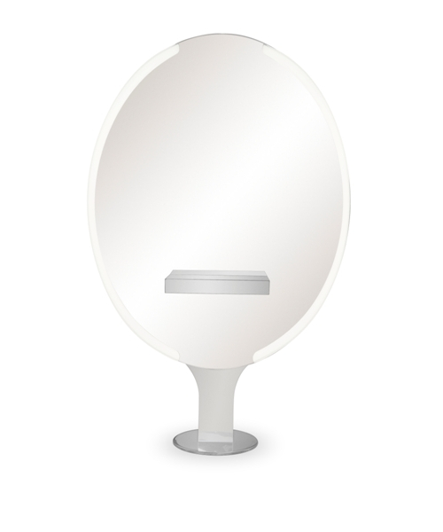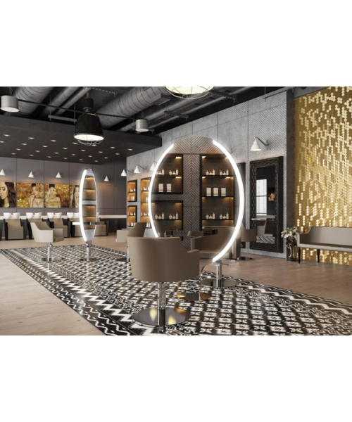 Зеркало парикмахерское "Pandora Wall LED" - на два рабочих места. Рабочий туалет оснащен светодиодной подсветкой LED, столешницами из нержавеющей стали, а также металлическим основанием округлой формы. Крепление к полу.