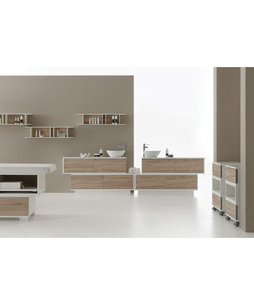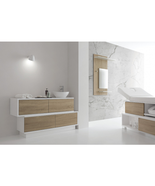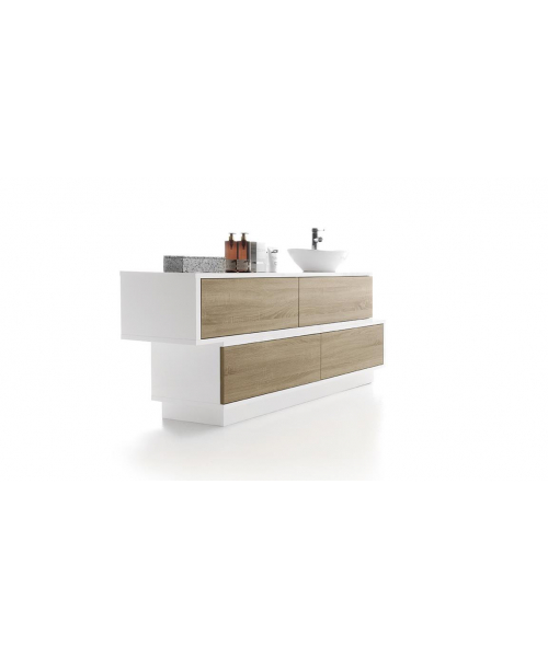 Это сочетание строгих форм и простых линий. Данный предмет мебели может применяться для различных нужд. Корпус выполнен из меламиновых панелей белого цвета. Модель комплектуется четырьмя выдвижными ящиками. Доступно несколько вариантов отделки ящиков – натуральный венге, белая лиственница, дуб бардолино. Ящики могут располагаться друг над другом, или же быть смещенными в одну из сторон. Также в комплектацию входит небольшой умывальник с рычажным смесителем. Умывальник выполнен из износоустойчивого и простого в уходе материала белого цвета. Смеситель выполнен из хромированной стали.