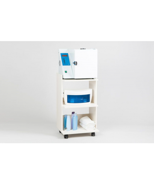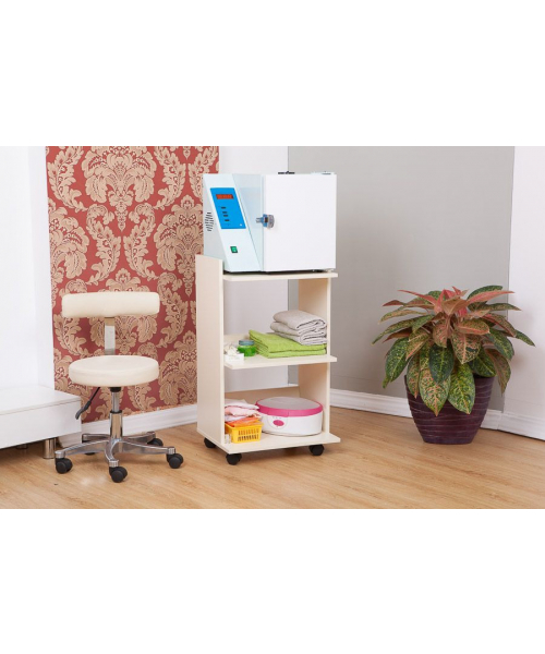 Столик косметолога три полки на колесах. Удобный косметологический столик-тележка с тремя полкапи, ограниченными бортиками с трех сторон. Расстояние между полками 33 см. позволяет ставить высокие флаконы с косметологическими средствами. Влагостойкое ламинированное ДСП порзволяет протирать и обрабатывать столик дез средствами.