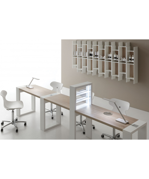 Используя несколько модулей, можно создать несколько полноценных рабочих мест. Модульная система позволяет скомпоновать рабочее место, в полной мере соответствующее требованиям. Дополнительно можно укомплектовать стол светодиодной лампой, вытяжкой, полкой для лаков.