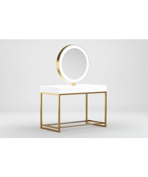 Зеркальное полотно в форме идеального круга с декоративной подсветкой, надёжная порошковая покраска, устойчивая к образованию ржавчины, вместительная столешница для инструментов, мощные металлические подножки с накладками из нержавеющей стали и максимально устойчивые опоры. Уникальное сочетание утонченного дизайна и безукоризненного качества исполнения.